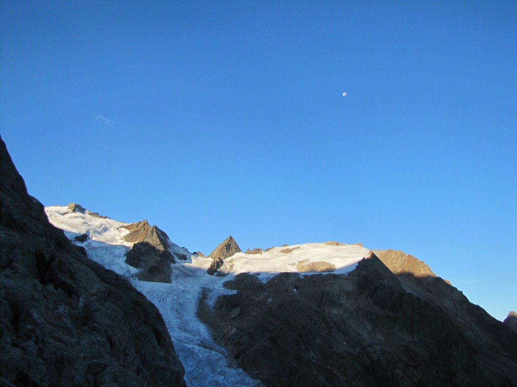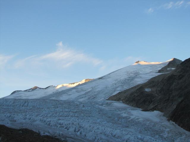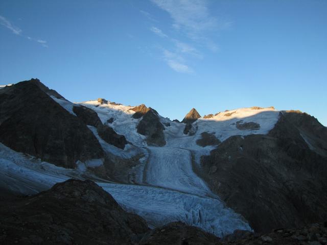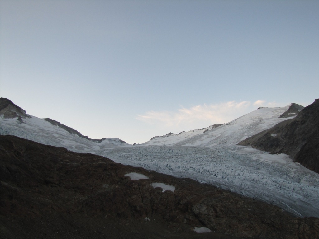 die Sonne zeigt sich noch nicht. Der Triftgletscher liegt noch im dunkeln