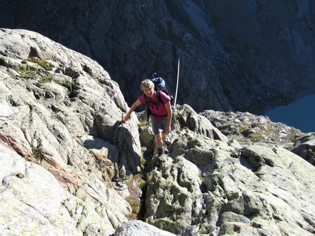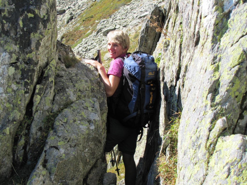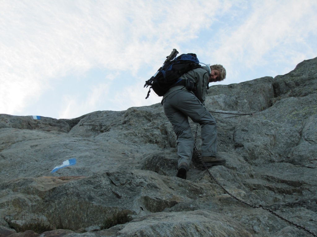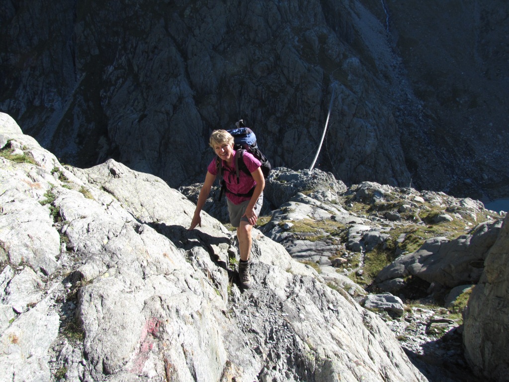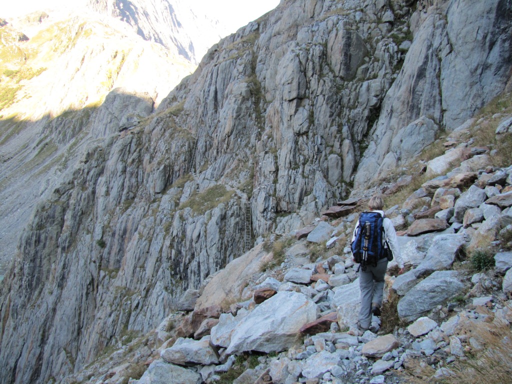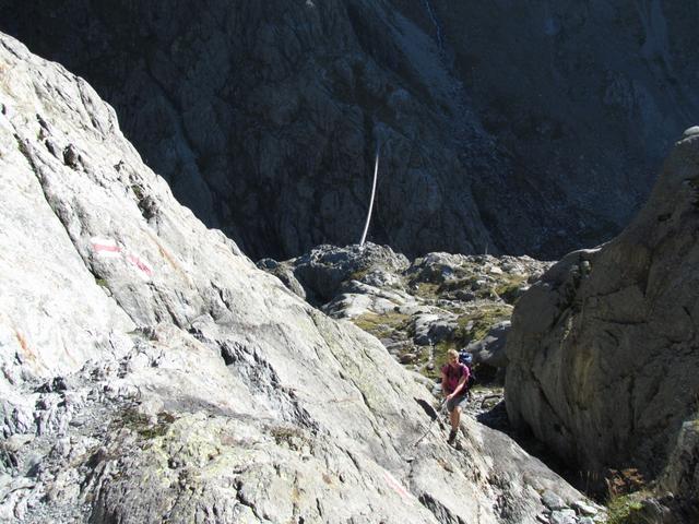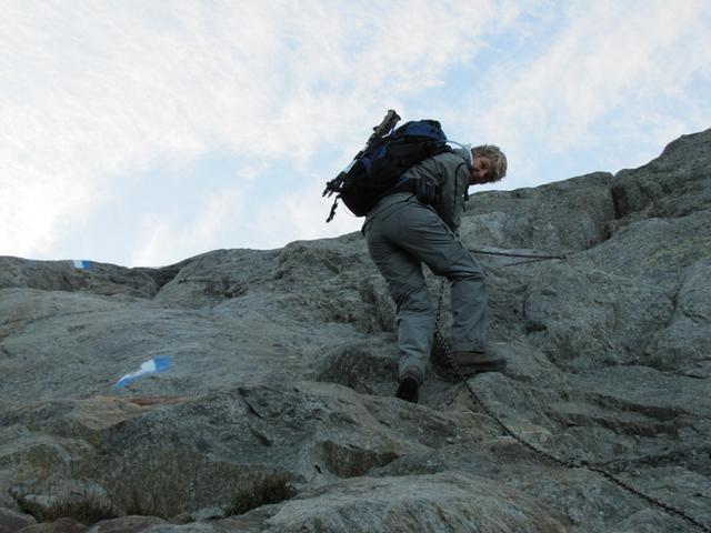 Mäusi bei der Felswand. Rassig geht es mit Hilfe der Ketten abwärts