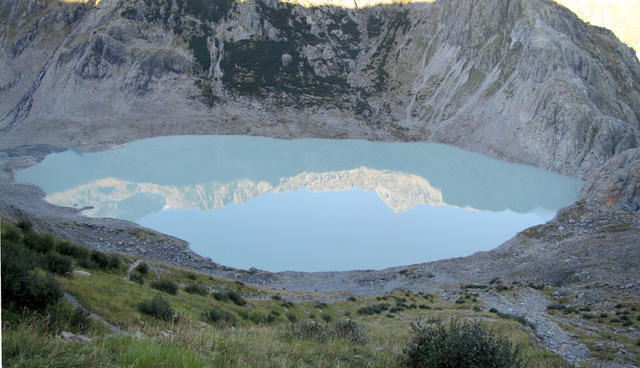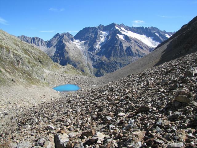 Geröll und Schutt bedecken das ganze Trifttälli. Einziger Lichtblick der stahlblaue Tälliseeli