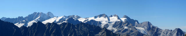 Breitbildfoto vom Gwächtenhorn, Chilchistock, Steinhüshorn, Triftgletscher, Furtwangsattel und Mährenhorn