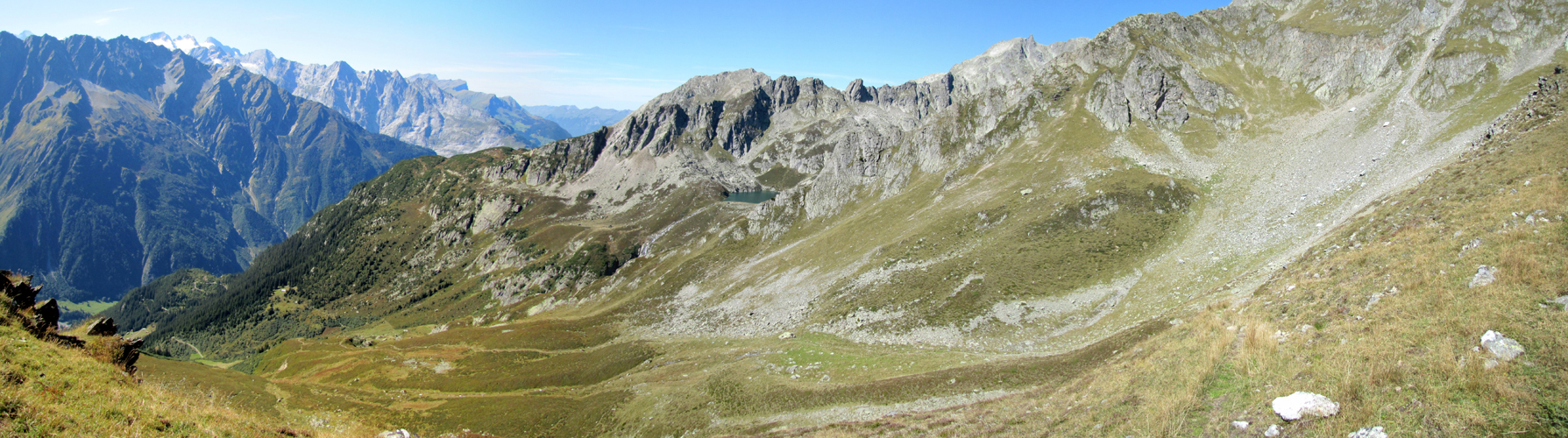 Breitbildfoto vom Furtwangsattel aus gesehen ins Trifttälli. Links Windegghorn, geradeaus die Tierbergkette mit seinen Gletsche