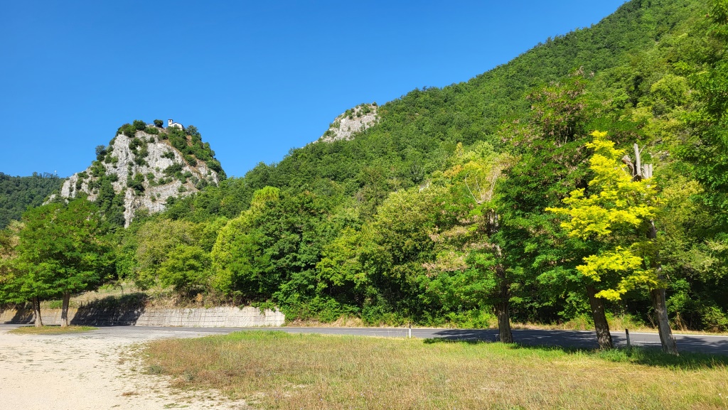 wir erreichen am Talende Roccaporena. Rechts von uns das Wohnhaus der hl. Rita