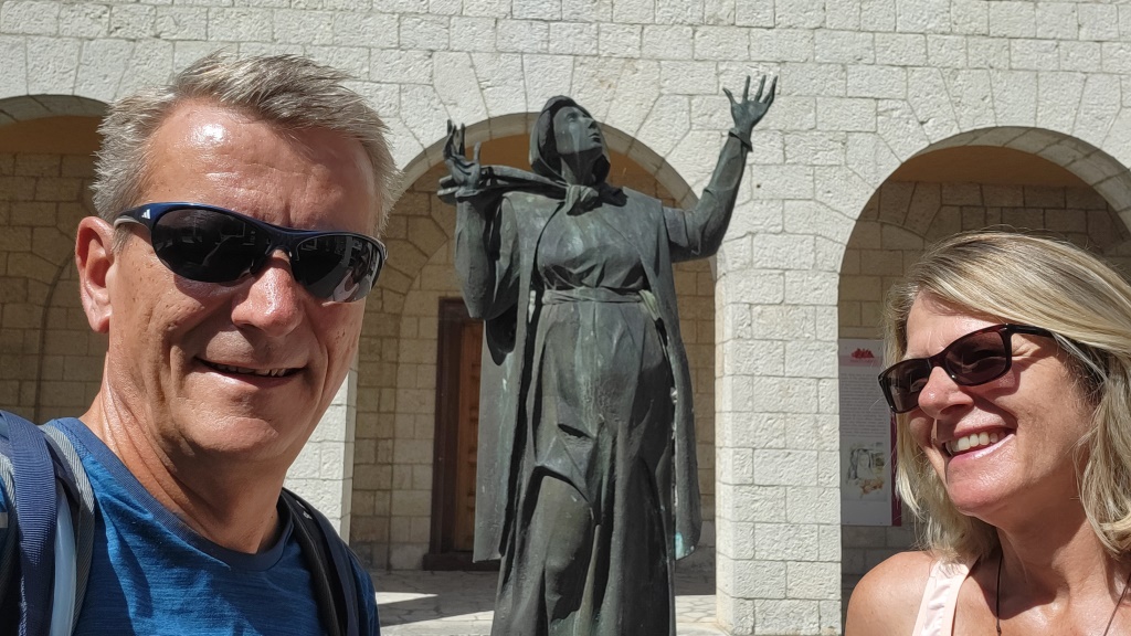 rechts von uns die Grotta D'Oro mit dem grossen Kreuz. Sie war oft Ort des Gebets der hl. Rita
