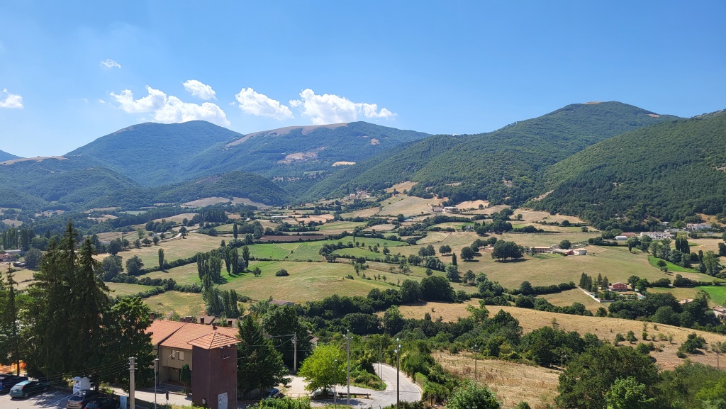 kurz vor Cascia blicken wir von der Strasse hinunter nach Cascia und zu unserem Hotel