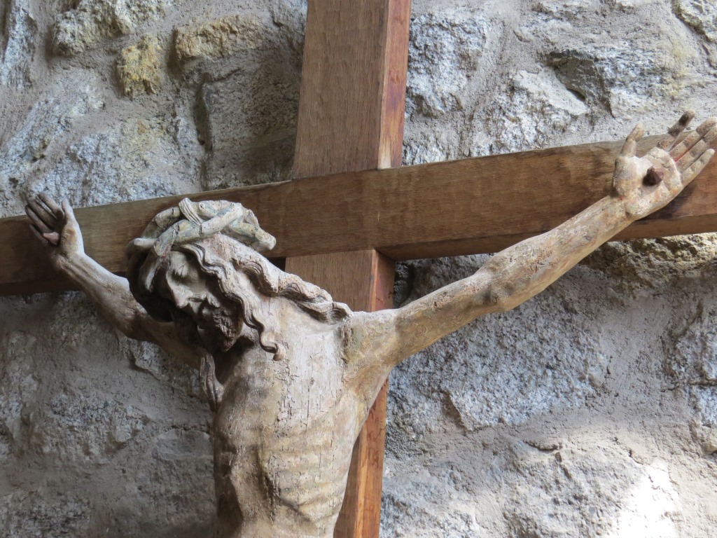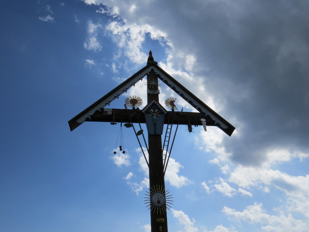 der Weg führt an einem ganz speziellen Kreuz vorbei. Diverse Schnitzfiguren können betrachtet werden