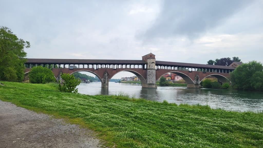 der Ponte Coperto taucht vor uns auf. Er ist das Wahrzeichen von Pavia und überspannt mit fünf Arkaden den Ticino