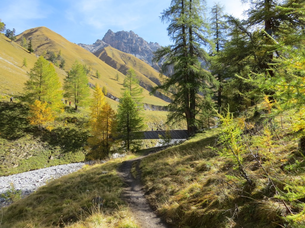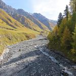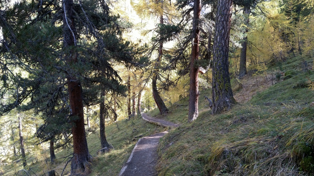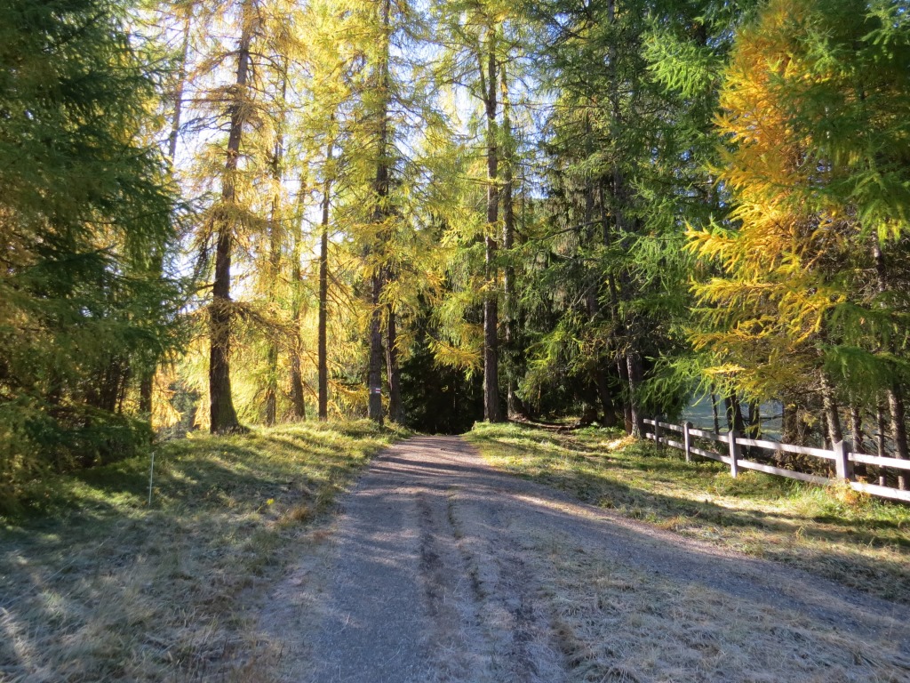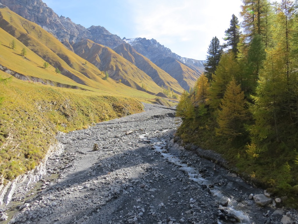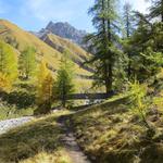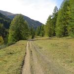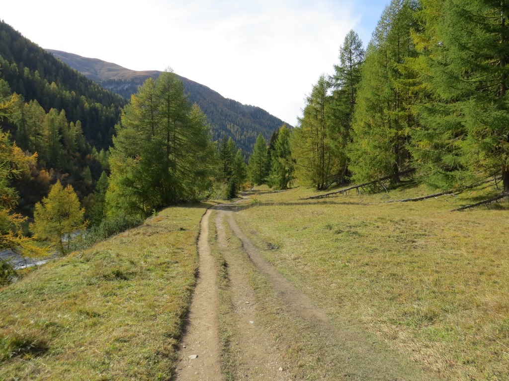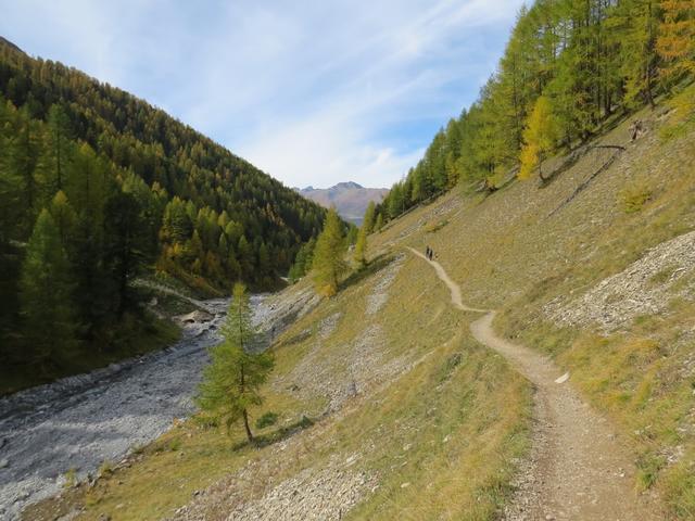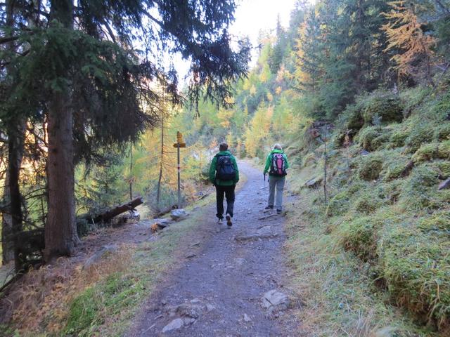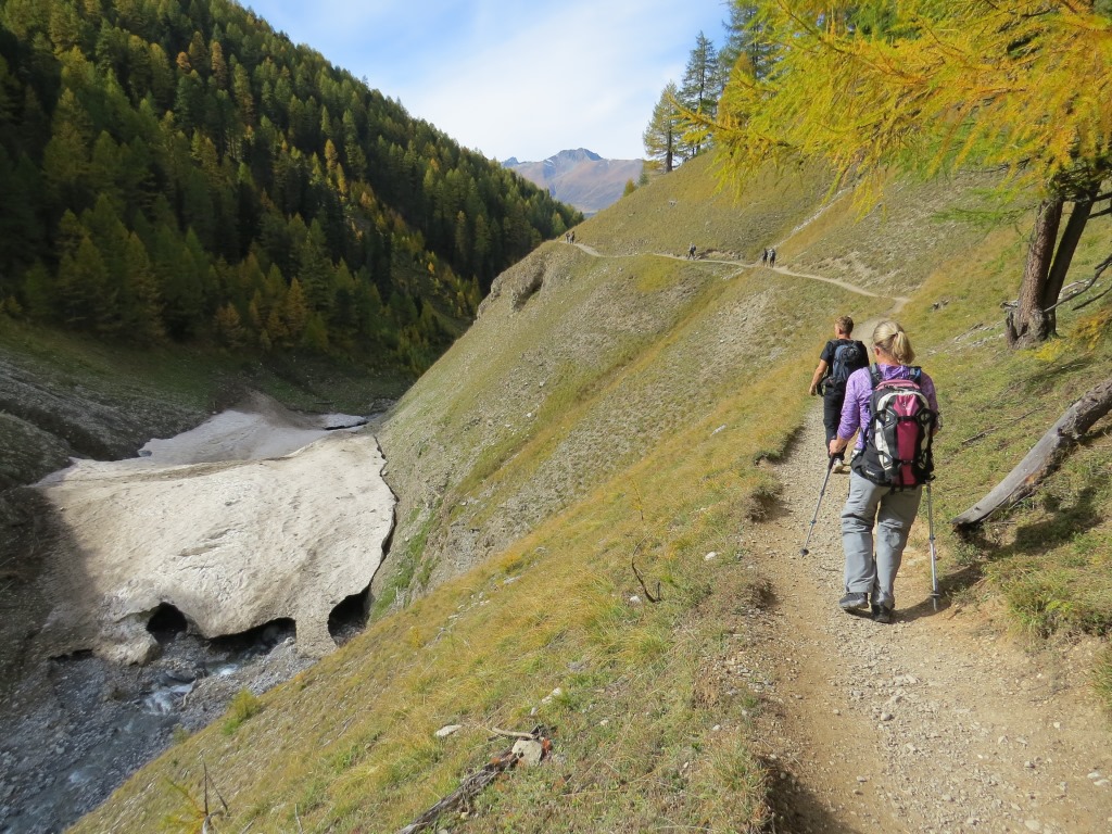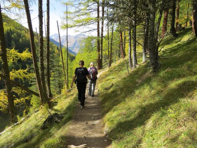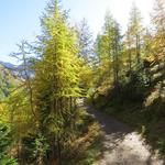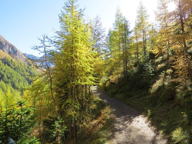 durch sich langsam färbenden lichten Lärchenwald, wandern wir talauswärts