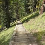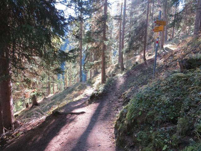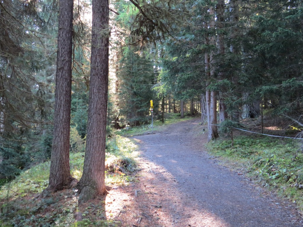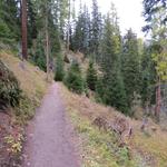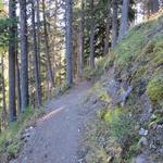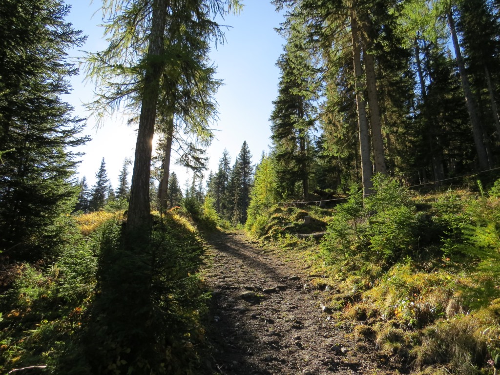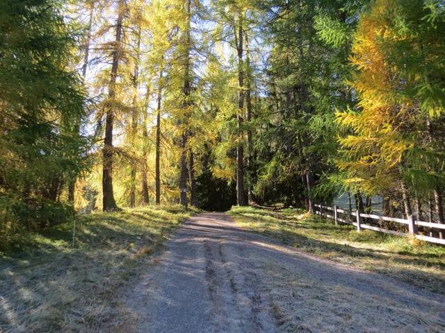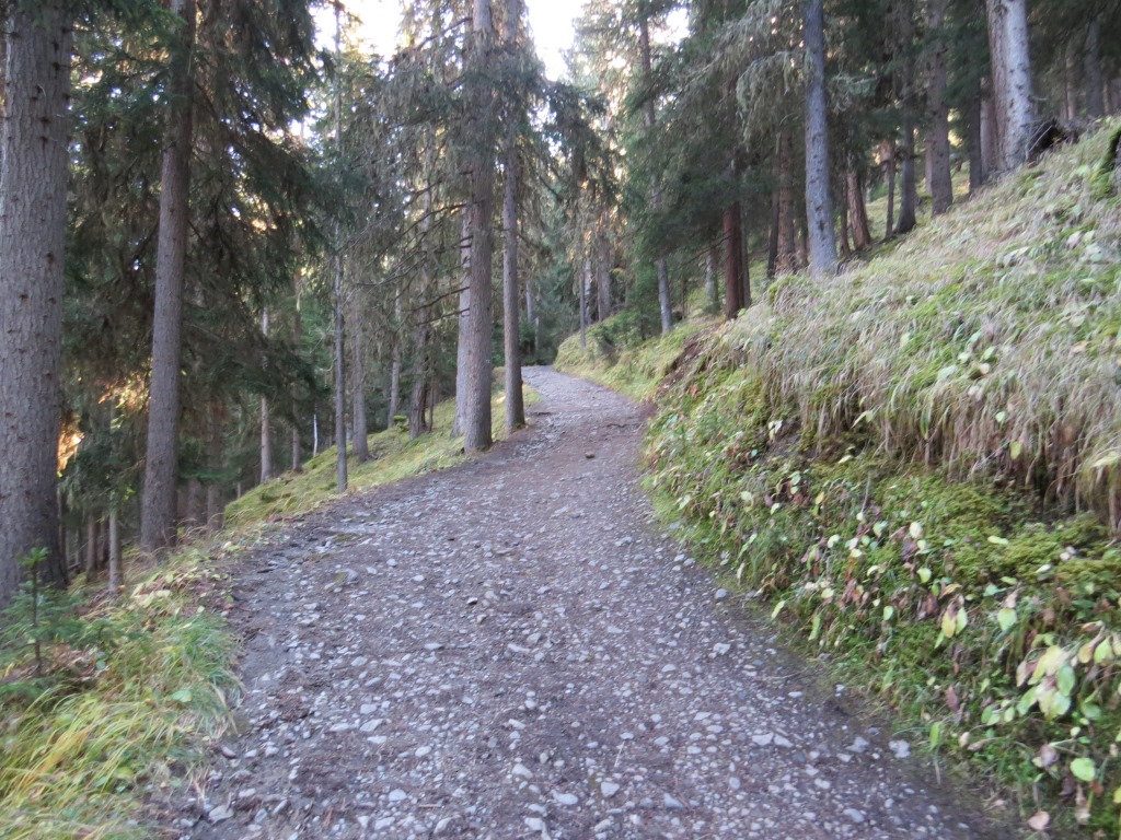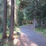 relativ eben führt uns der Waldweg weiter, dann wendet sich der Weg leicht abwärts nach rechts ins Val da Scrings