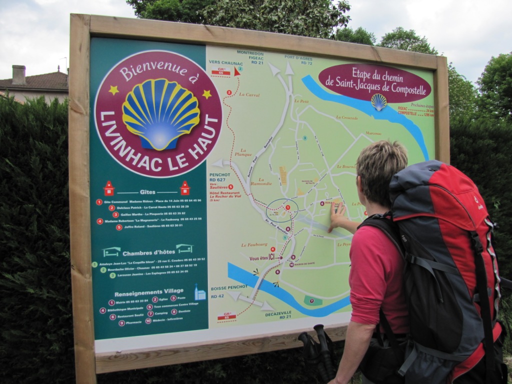 Mäusi erkundigt sich bei der Infotafel in Livinhac le Haut ob ein Restaurant offen hat Datum 21.06.2010