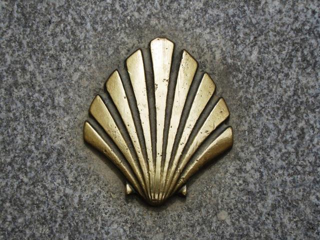 im Boden eingelegte Muscheln zeigen einem in Mansilla de las Mulas wo der Jakobsweg hindurchführt Datum 02.09.2012