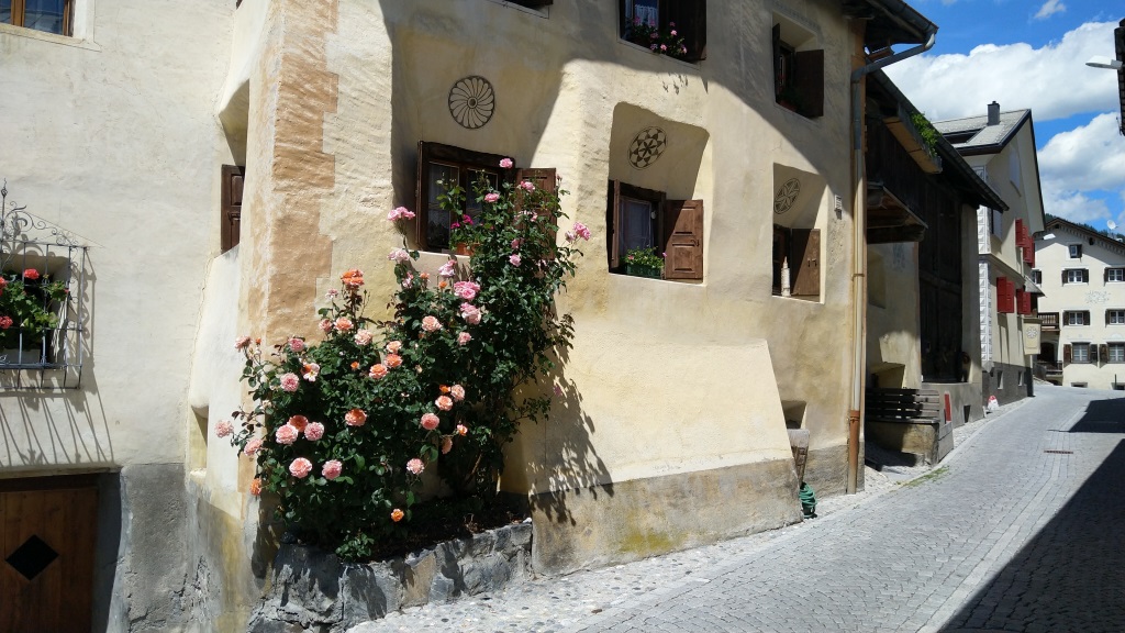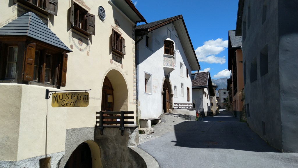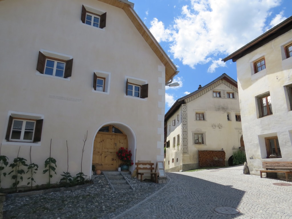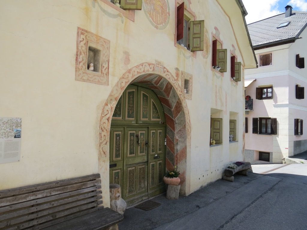 beim Dorfplatz in Sent. Wir bestaunen die stattlichen Häuser mit den geschweiften barocken Giebeln Datum 08.10.2022