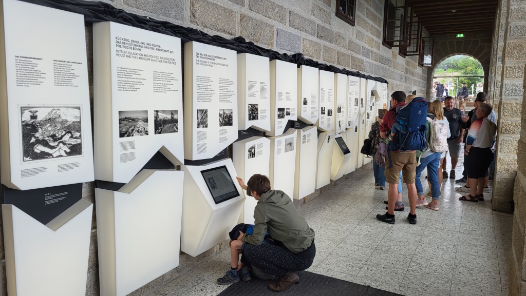 eine Ausstellung auf der Sonnenterrasse zeigt die Geschichte des Kehlsteinhauses auf Infotafeln