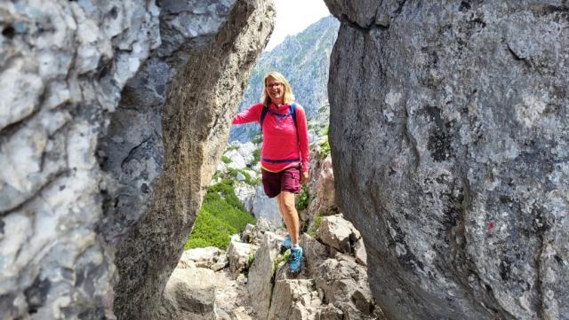 vom Gipfelkreuz führt der Weg leicht bergab in eine wildromantische Felslandschaft...