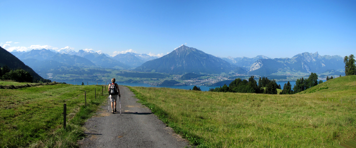 schönes Breitbildfoto mit dem Thunersee. Links der Niesen. Rechts der Stockhorn. Dort oben waren wir auch schon Datum 25.03.2013