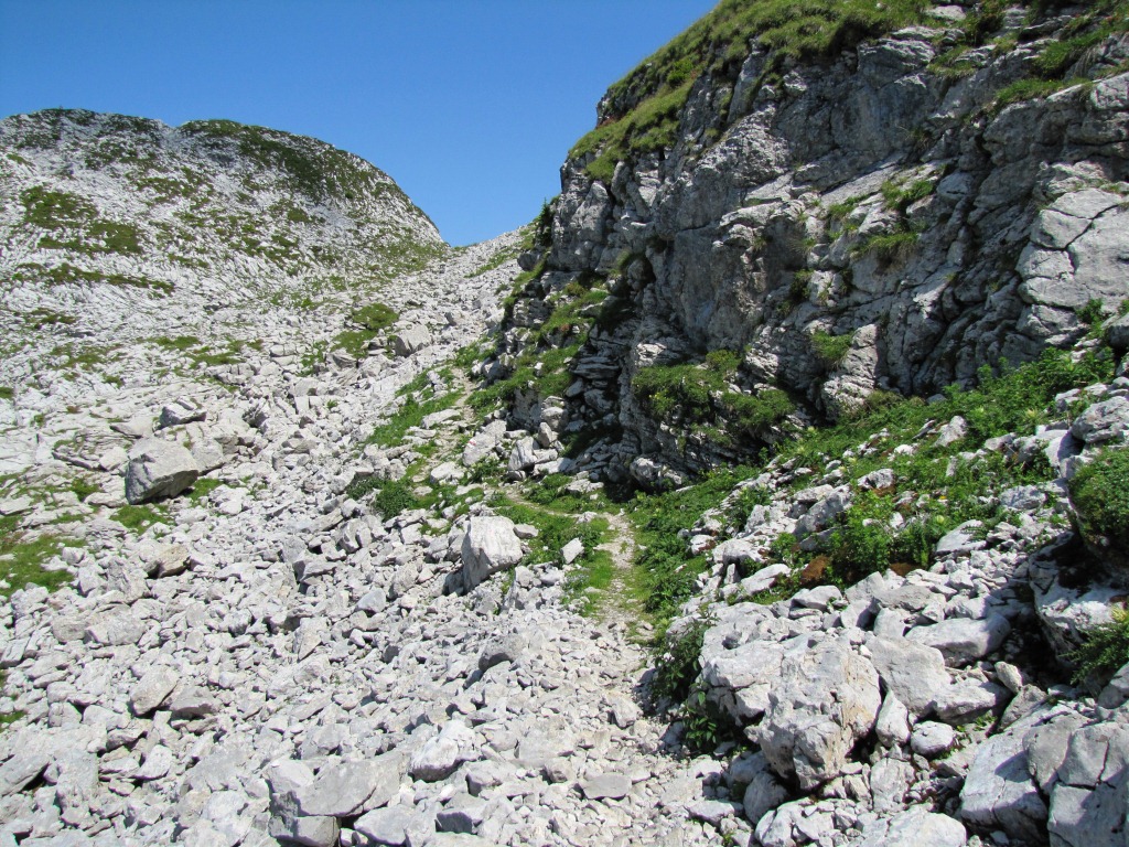 eine gut ausgebaute Steilrinne ermöglicht den Aufstieg zur Weggabelung bei Chäle Datum 25.03.2013