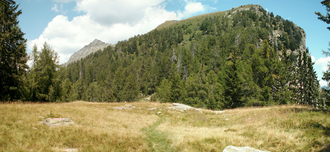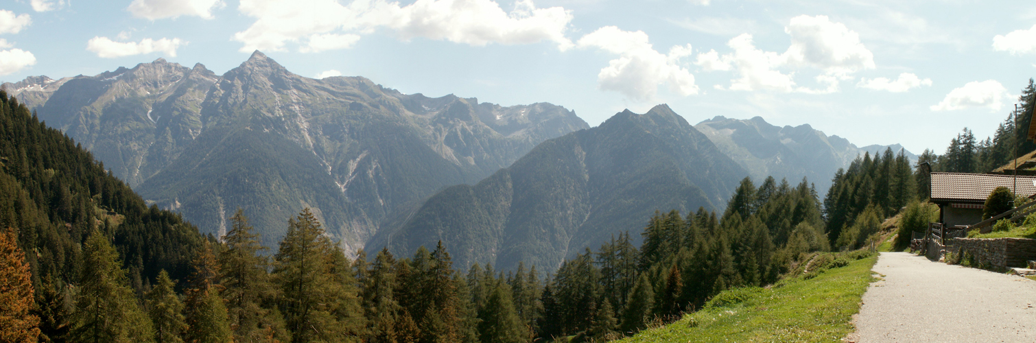 Breitbildfoto von Alpe de Bec sura Richtung Pass Buffalora und Cima de Nomnom