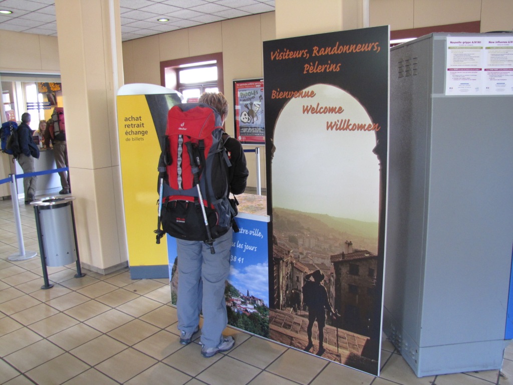Bahnhof Le Puy. Mäusi schaut sich die Pilger Broschüren an