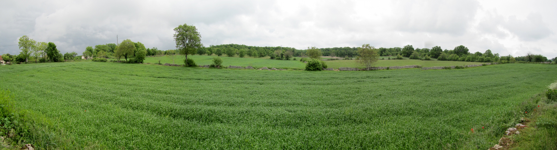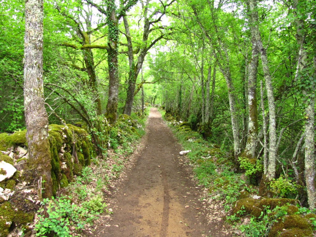 Blick zurück nach Cajarc. Gut zu sehen die stillgelegte Bahnlinie Cajarc - Cahors
