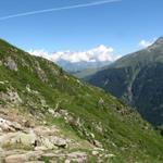 tief unter uns das Val Sumvitg. Rechts sieht man den Übergang in die Greina Ebene und zur Terri Hütte