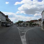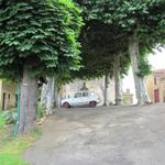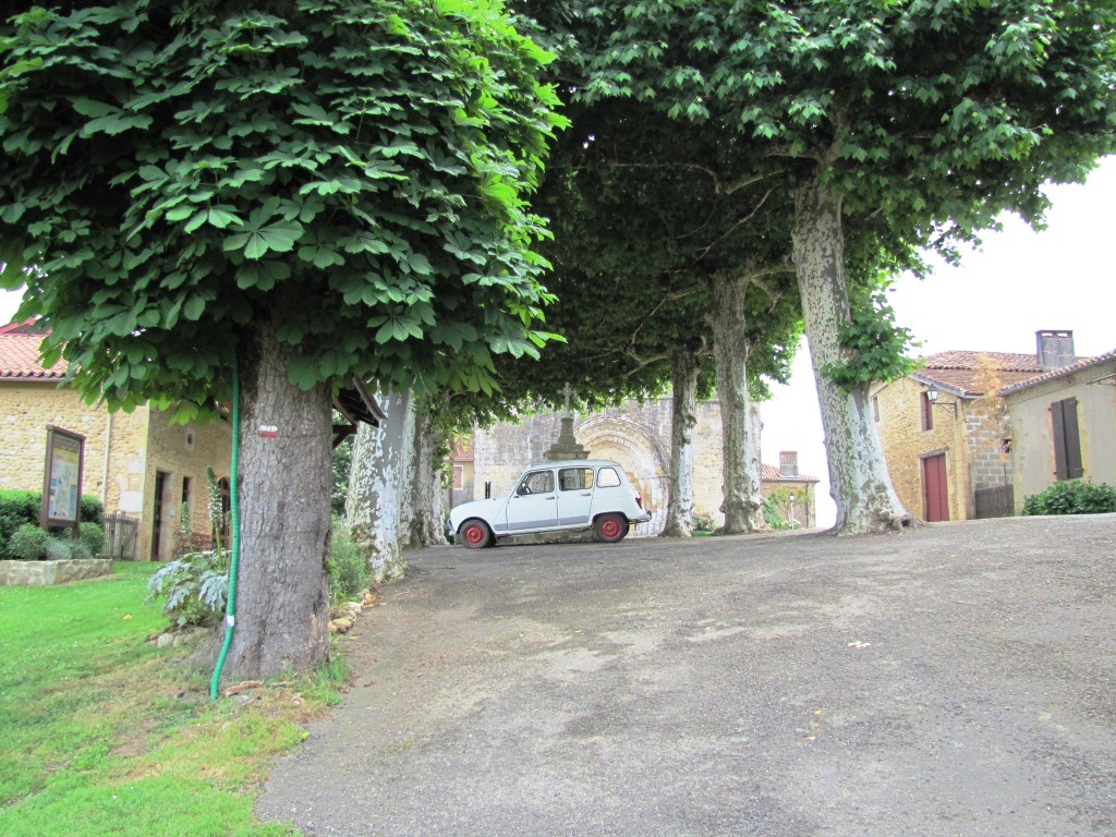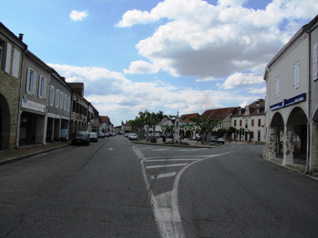 Mäusi überquert den schönen Dorfplatz von Arzacq-Arraziguet