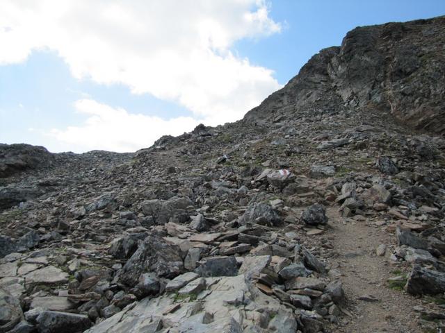 bei Totälpli biegt der Bergweg rechts ab Richtung Grat. Wir verlassen zum Glück die Skipisten