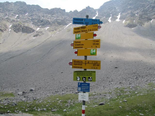 Wegweiser bei der Wegverzweigung Punkt 2460 m.ü.M.