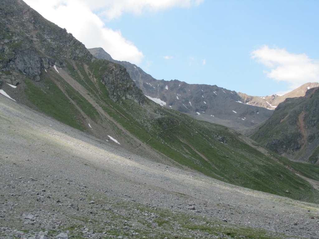 Blick vom Gredigs Fürggli zu dem Tunnel wo man im Winter mit den Skis durchfährt. Wir müssen auch hindurch