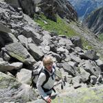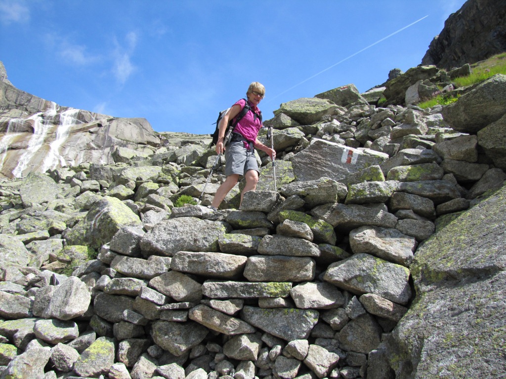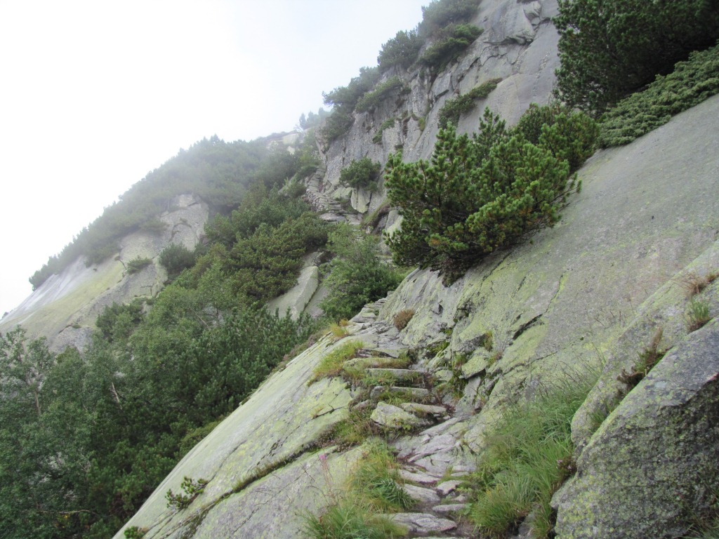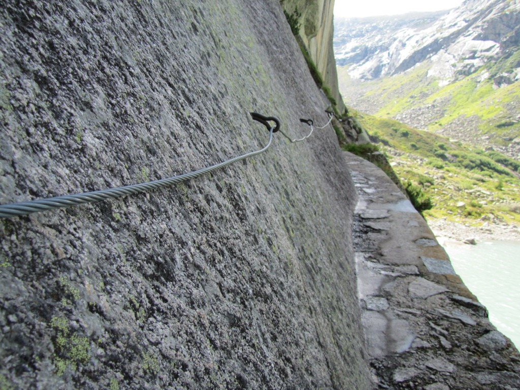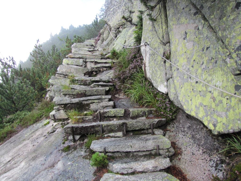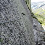 die kniffligste Stelle ist mit einem Seil gesichert. Granitstufen erleichtern den Aufstieg