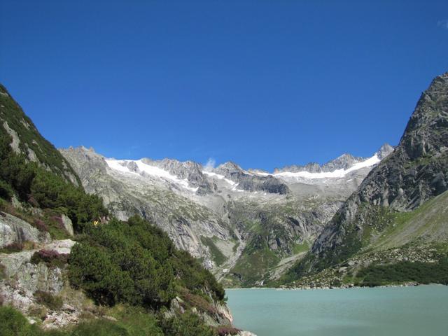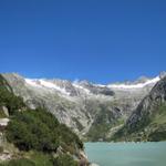 tief unter uns der Gelmersee. Rechts am Horizont der Gruben- und Gauligletscher