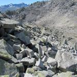 über griffigen Blockschutt führt der Bergweg abwärts. Datum 14.10.2011