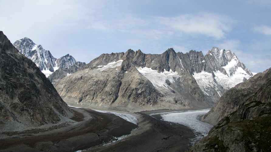 Breitbildfoto Finsteraarhorn links. Rechts Lauteraarhorn und zusammenfluss des Finster- und Lauteraarhorngletscher Datum 31.01.2017