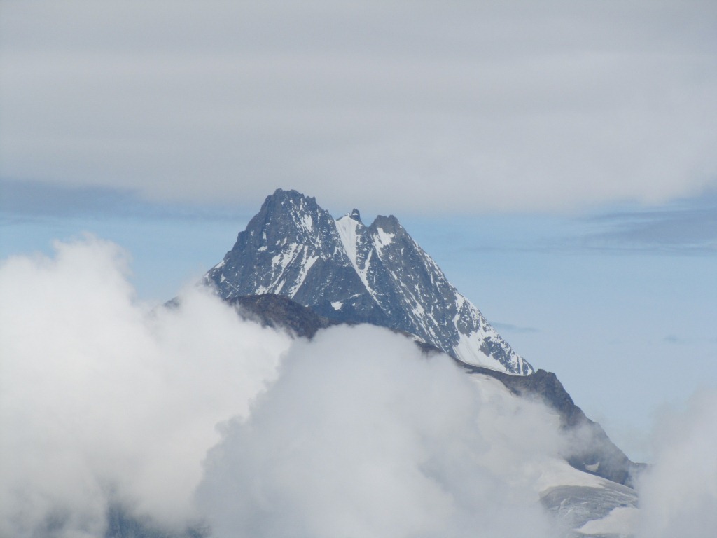 Finsteraarhorn und Lauteraarhorn schauen zwischen den Wolken heraus