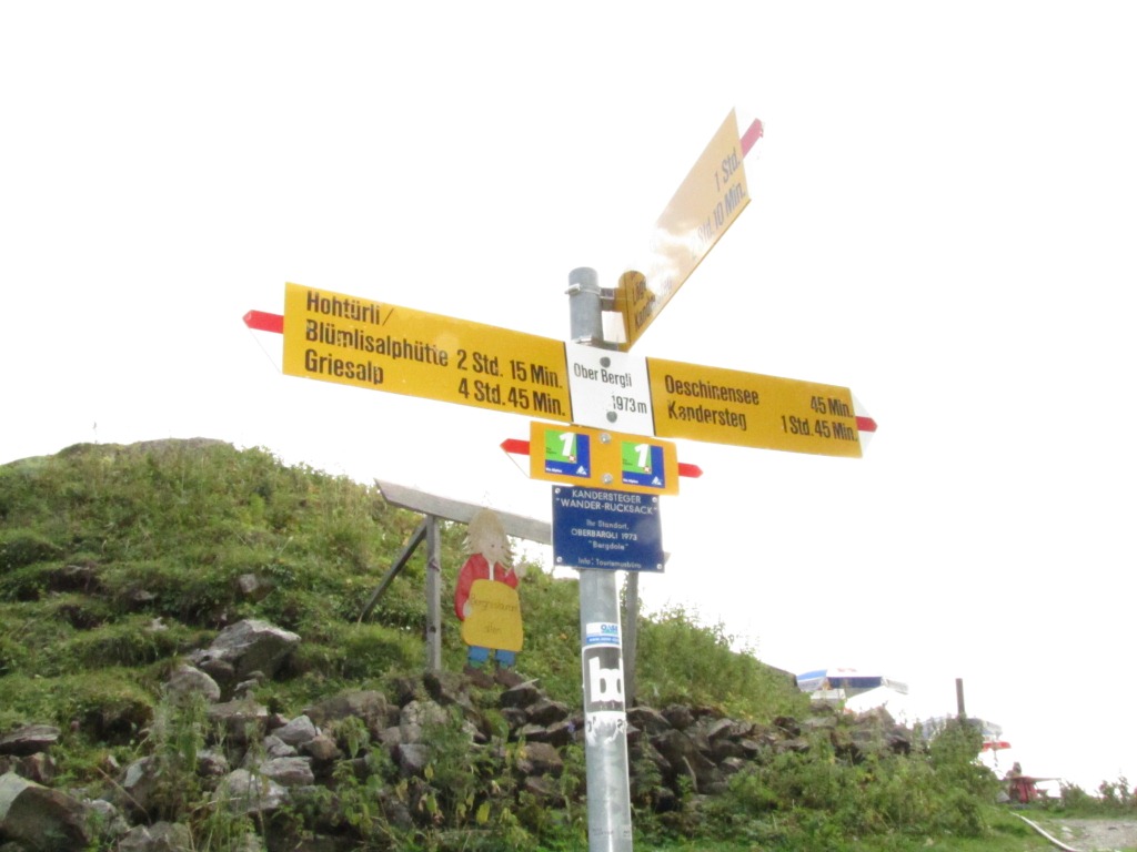 Wegweiser bei Ober Bärgli 1978 m.ü.M. Der Weg führt uns nun links haltend weiter abwärts zum Oeschinensee