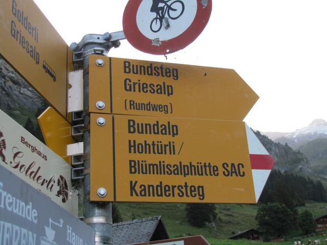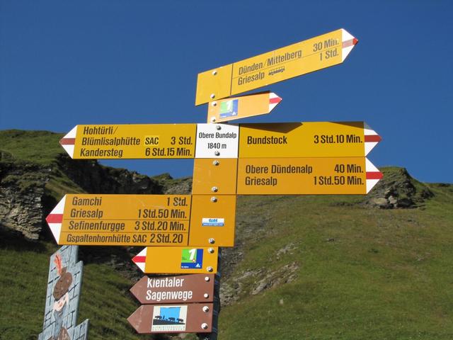 Wegweiser bei Bundsteg 1500 m.ü.M. unser nächstes Ziel die Bundalp