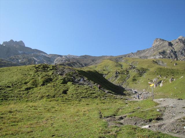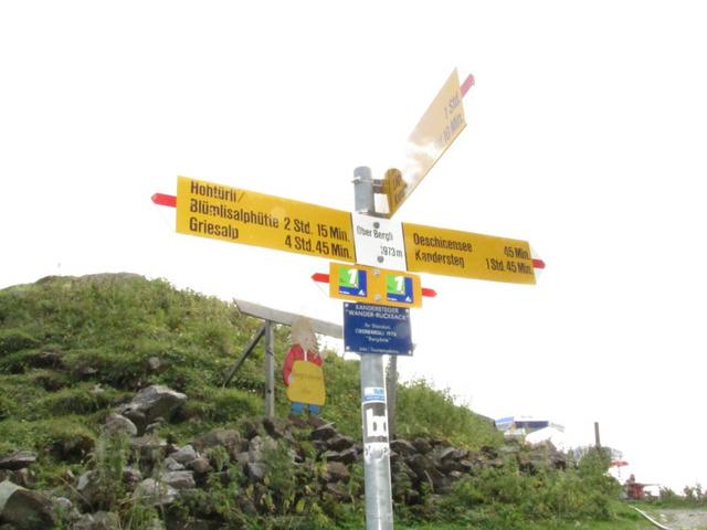 Wegweiser bei Ober Bärgli 1978 m.ü.M. Der Weg führt uns nun links haltend weiter abwärts zum Oeschinensee
