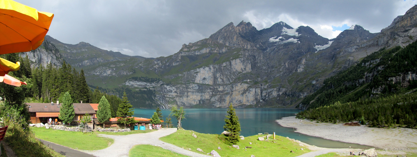Breitbildfoto mit Blick auf den Oeschinensee von der Terrasse aus gesehen
