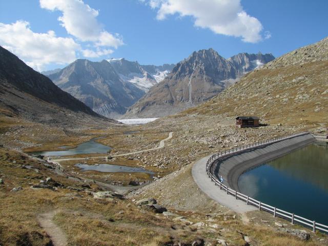 Breitbildfoto vom Märjelental mit Stausee. Gut ersichtlich am gegenüberliegenden Hang, wo früher der Gletscher war Datum 07.02.2017