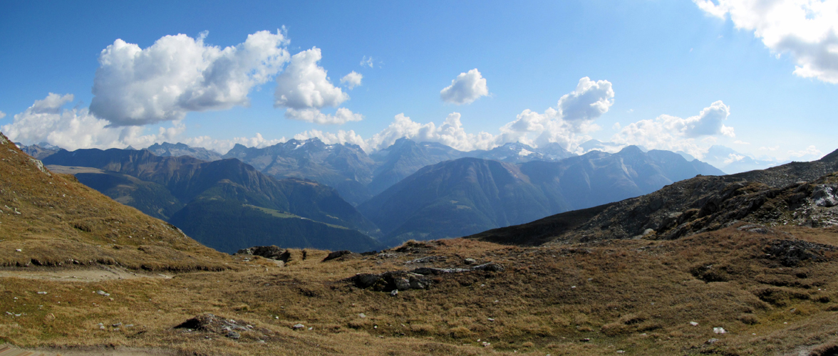 Breitbildfoto mit Blick Richtung Süden ins Binntal mit Ofenhorn, Albrunhorn, Helsenhorn und Monte Leone Datum 07.02.2017