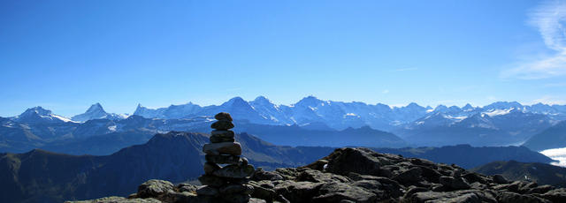 Breitbildfoto mit Blick Richtung Augstmatthorn und das Dreigestirn Eiger, Mönch und Jungfrau