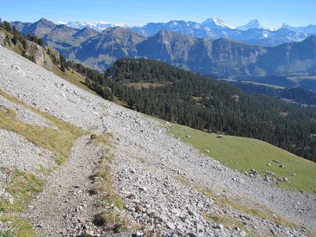 was für eine Aussicht während dem Abstieg. Brienzerrothorn Kette in Grün. Die Berner Riesen glänzend weiss