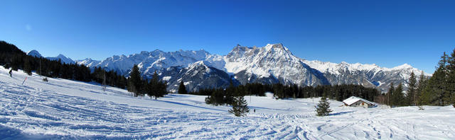 Breitbildfoto von der Hüenderegg aus gesehen. Unser weiterer Wegverlauf Selez - Eggen