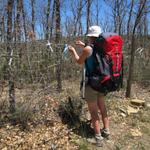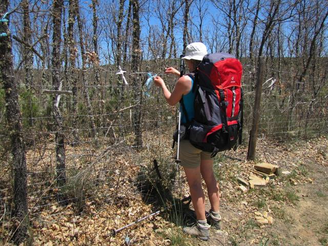 Hannelore befestigt ein Kreuz beim Maschenzaun. Viele hunderte von Kreuzen sind schon vorhanden