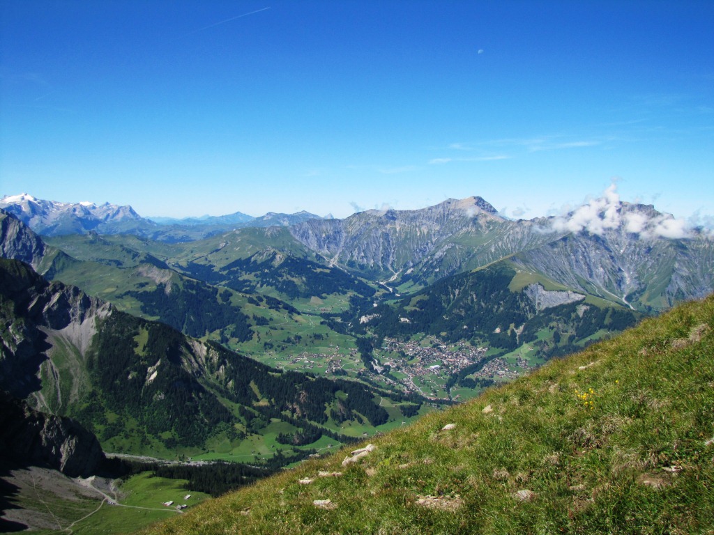 Tiefblick Richtung Adelboden. Ganz links der Wildstrubel Datum 02.04.2013