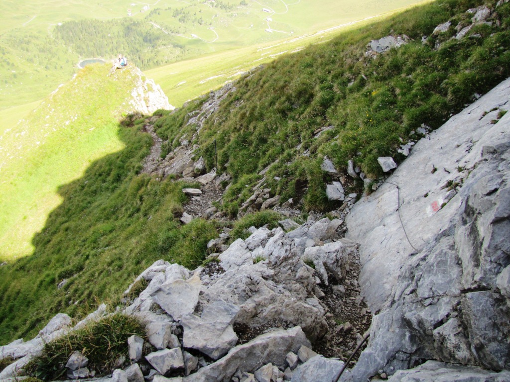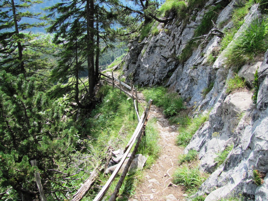der Abstieg beginnt recht aufregend. Drahtseile und Markierungen leiten uns nordseitig über eine ausgesetzte Felsstufe abwärts Datum 07.04.2013