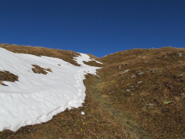 der Wanderweg führt einen grossen Rechtsbogen durch. Der Wanderweg ist nicht überall ersichtlich