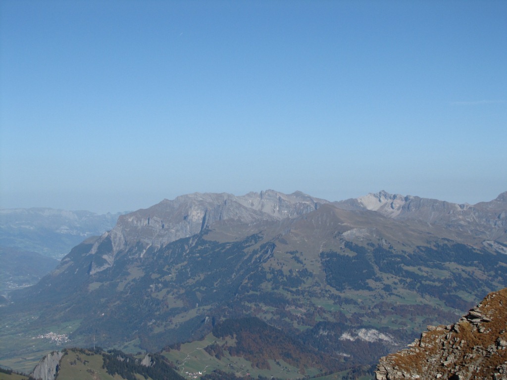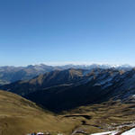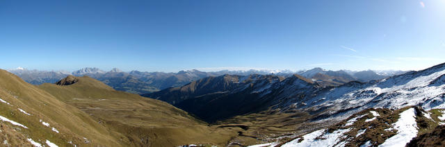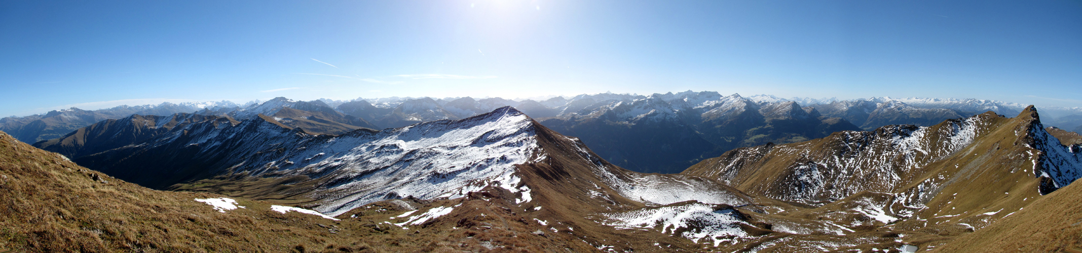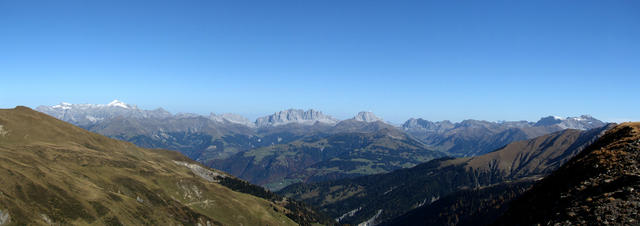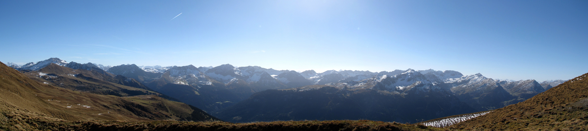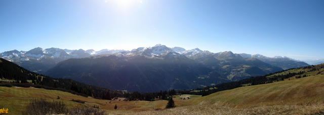 Breitbildfoto. Der Blick reicht bis in die Surselva. Was für ein Prachtswetter