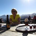Mäusi geniesst die warme Sonne. In kurzen Hosen im Schnee, so ist der Herbst in den Alpen