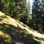 über einen duftenden Bergwald führt der einfache Wanderweg aufwärts Richtung Tenner Chrüz