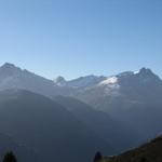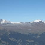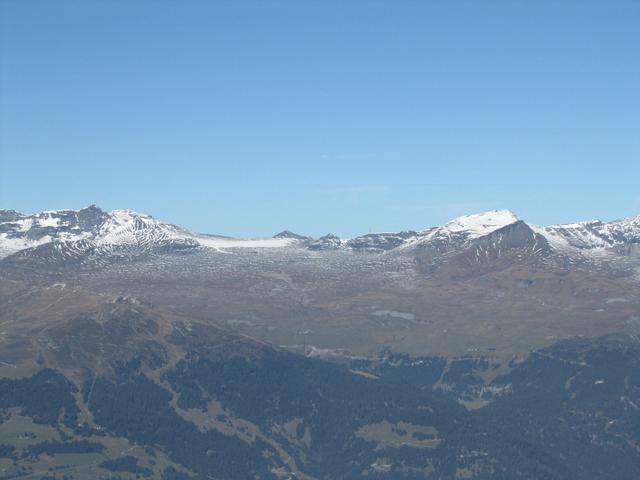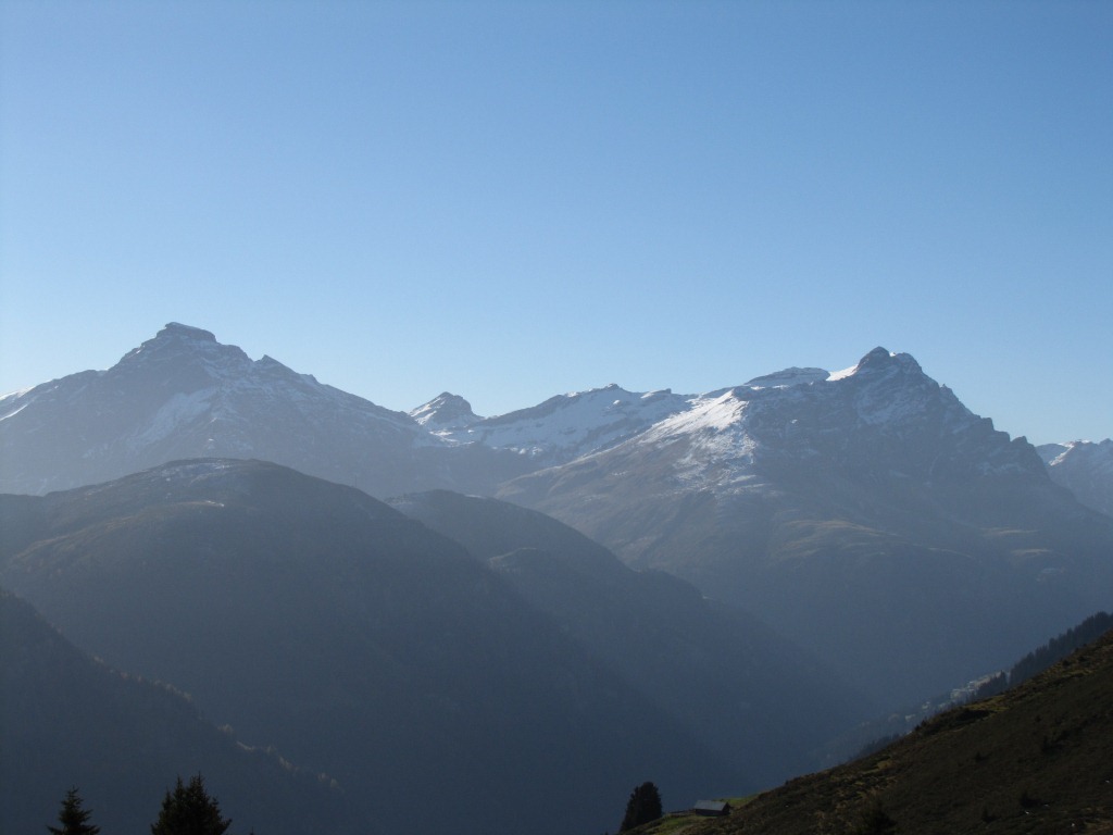 schönes Breitbildfoto mit Blick ins Safiental. Links Piz Beverin und Bruschghorn, rechts Piz Fess
