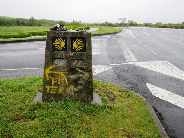 kurz nach Hospital beim grossen Kreisel. Rechts geht es nach Muxia, links nach Fisterra Datum 20.10.2013